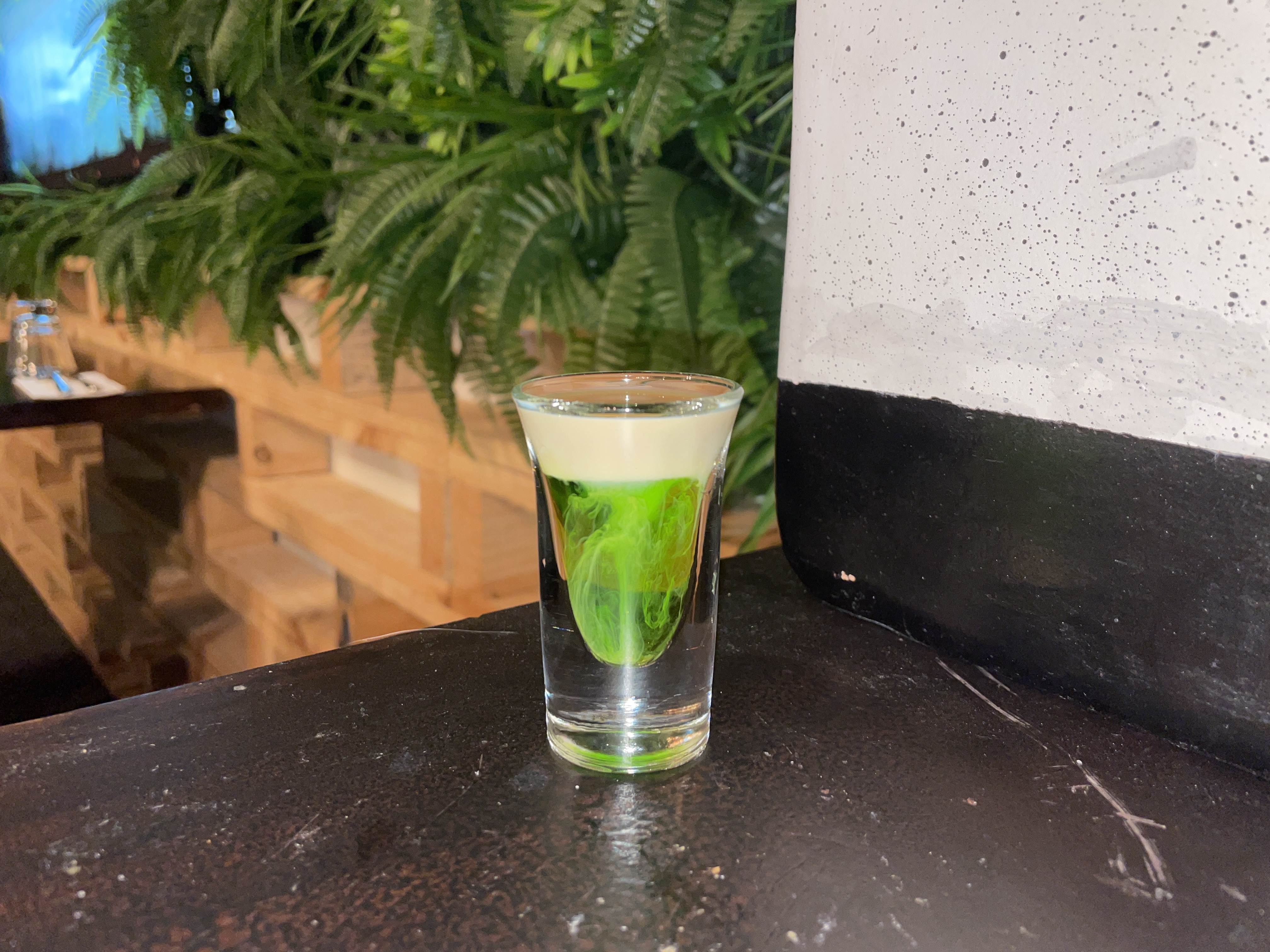 The Alien Secretion cocktail is surprisingly mild tasting. The midori and pineapple Juice.
